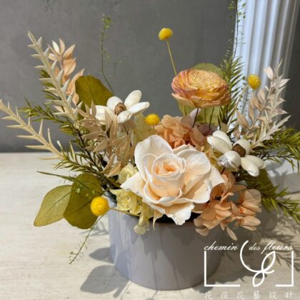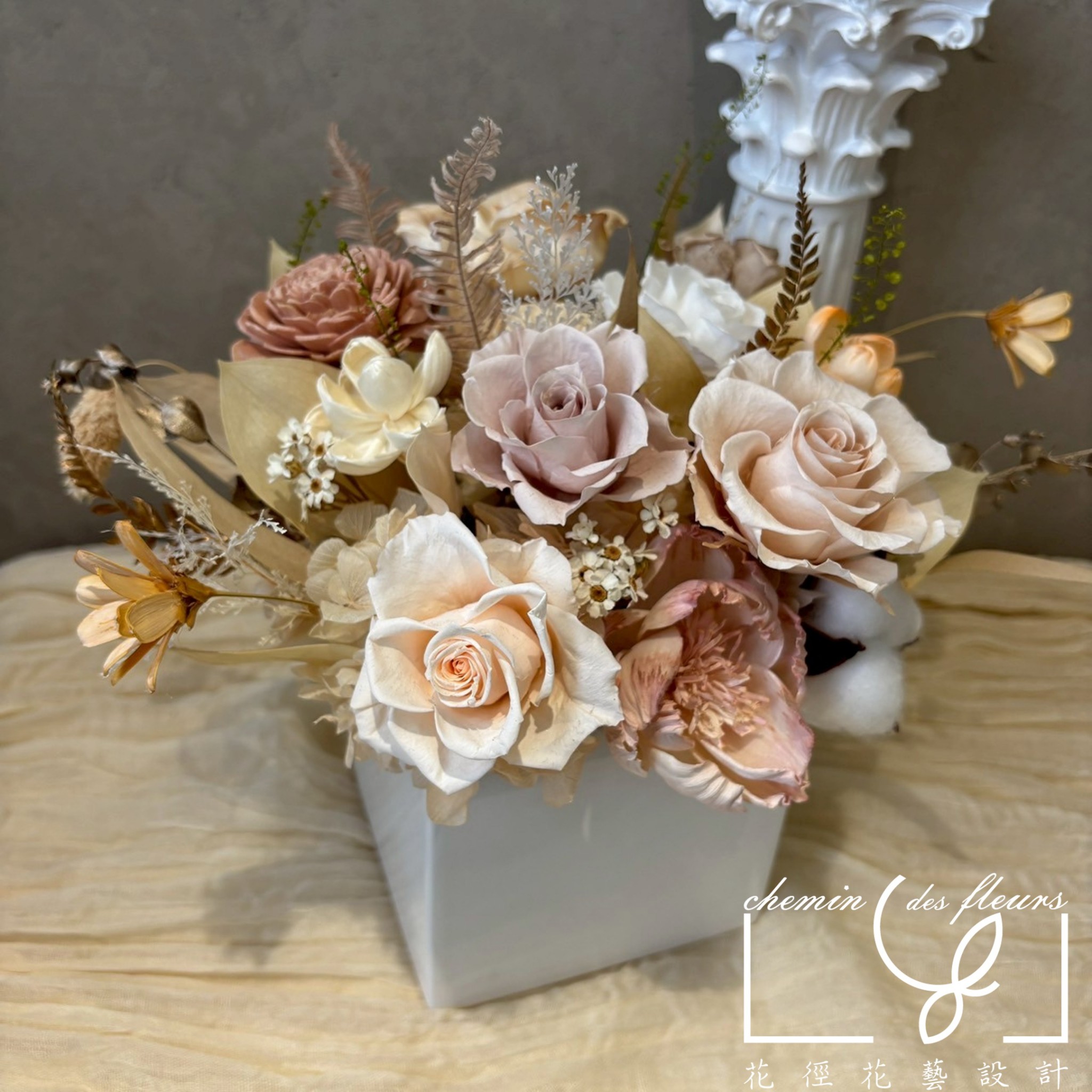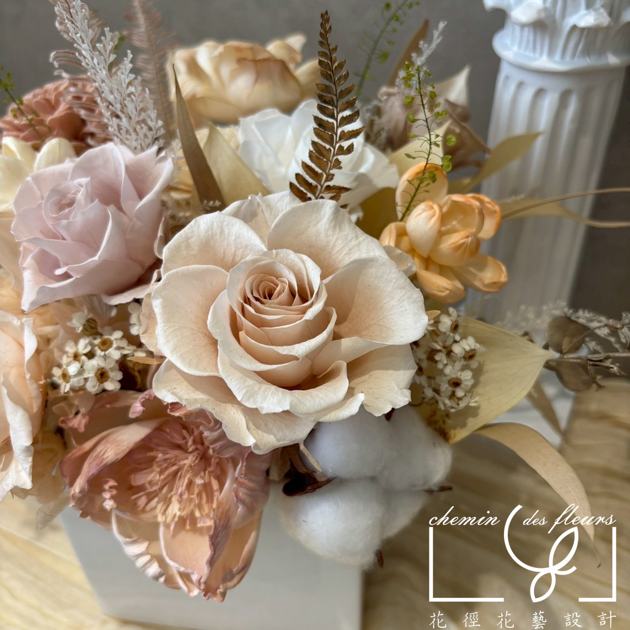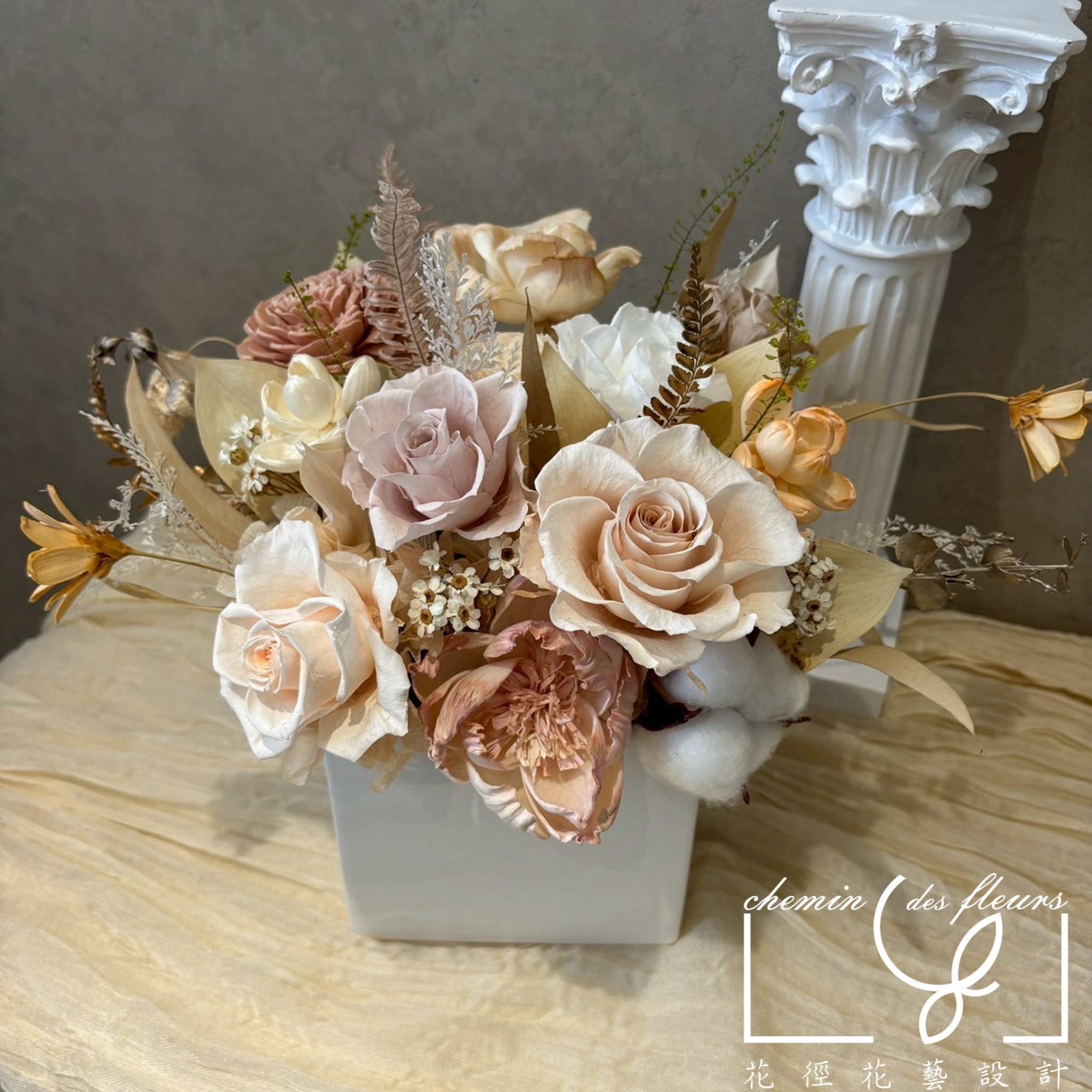 🔹花材、配飾、花器、包裝、緞帶及所需各項原材料等皆可能因季節或實際庫存而有所改動,如遇缺貨或品質欠佳時,花藝師會優先以風格相近材料做替換,將不另行通知。 永生花禮皆為手工製作,材料及工法的不同將存在尺寸上的誤差(±5cm),要求精準者請一定注意斟酌購買。