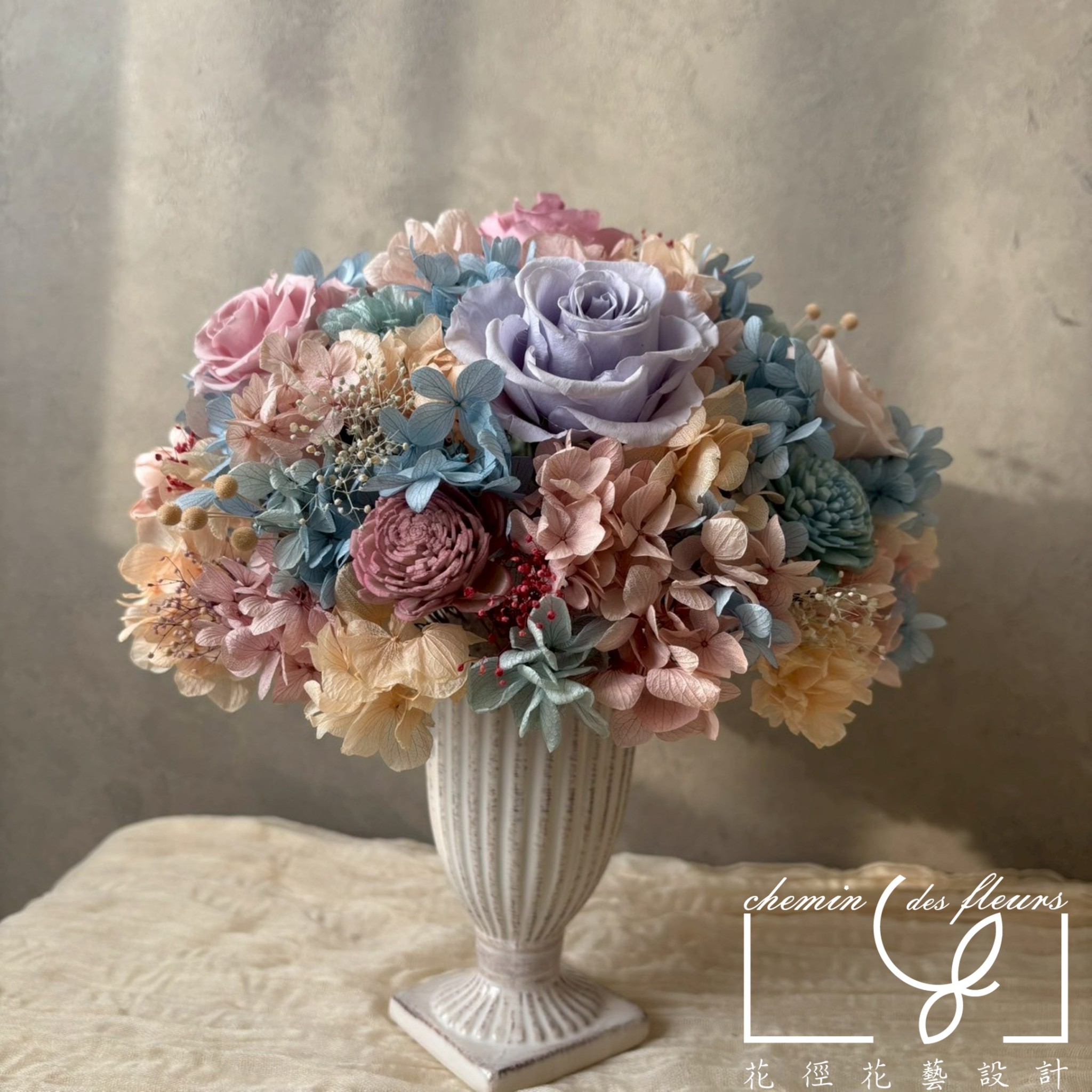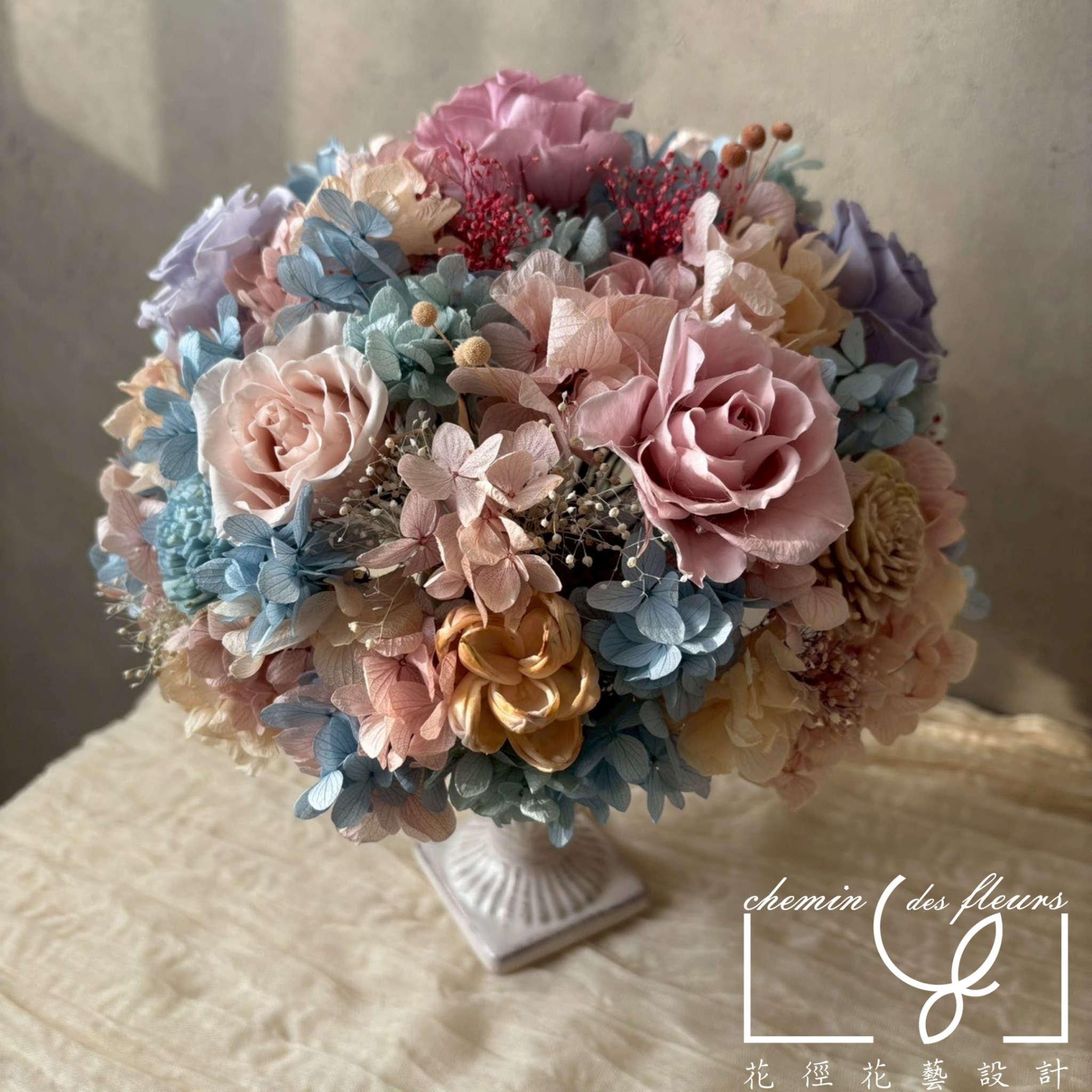 🔹花材、配飾、花器、包裝、緞帶及所需各項原材料等皆可能因季節或實際庫存而有所改動,如遇缺貨或品質欠佳時,花藝師會優先以風格相近材料做替換,將不另行通知。 永生花禮皆為手工製作,材料及工法的不同將存在尺寸上的誤差(±5cm),要求精準者請一定注意斟酌購買。